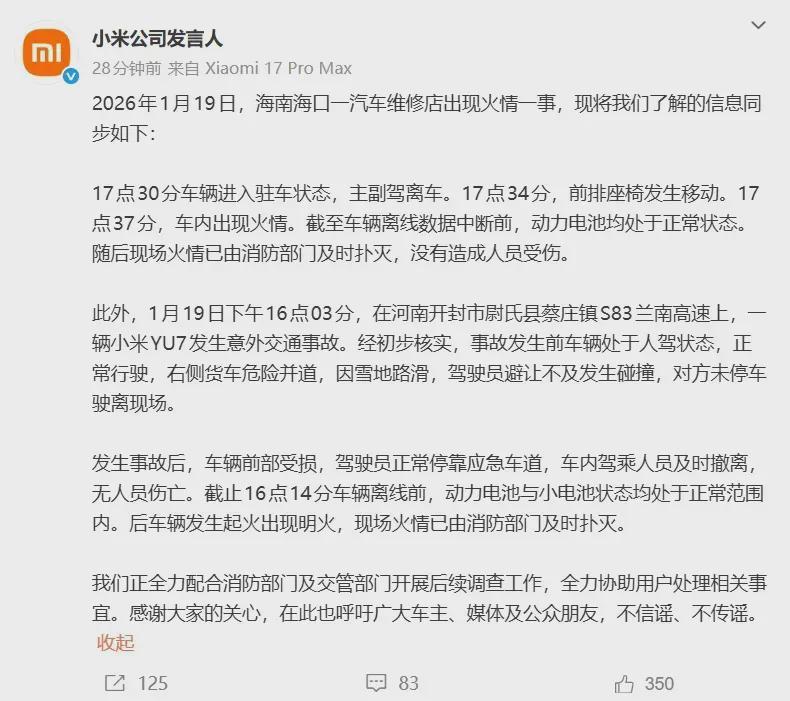 可海口维修店静止状态发生起火爆燃,小米很难说得清这跟车辆完全无关,此前类似静止状态自燃的事故,多跟天气和车主不小心在车内放了容易起火的物品有关。